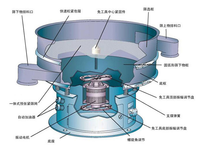 塑料震動篩主要由進料口、防塵蓋、出料口、束環、篩網、配重塊、上部重錘、振動體、振動電機、彈簧、下部重錘、機座等部分組成。塑料震動篩采用立式振動電機作為激振源,通過振動電機上下兩端的偏心重錘將旋轉運動轉變為水平、垂直、傾斜的三次元運動,并傳遞到篩面上,物料通過入料口進入設備內,根據不同物料篩分要求,物料經過1-5層采用不同目數的金屬編織篩網的篩分層,在這個過程中,位于各層的篩網下的清網裝置通過頻率振動不斷撞擊不銹鋼篩網,使篩網上層物料能夠順暢的透網篩分,并有效解決了物料堵網問題出現,不同目數的物料通過各層對應目數的篩網后在各層的出料口排出,實現篩選除雜或過濾分級的目的。